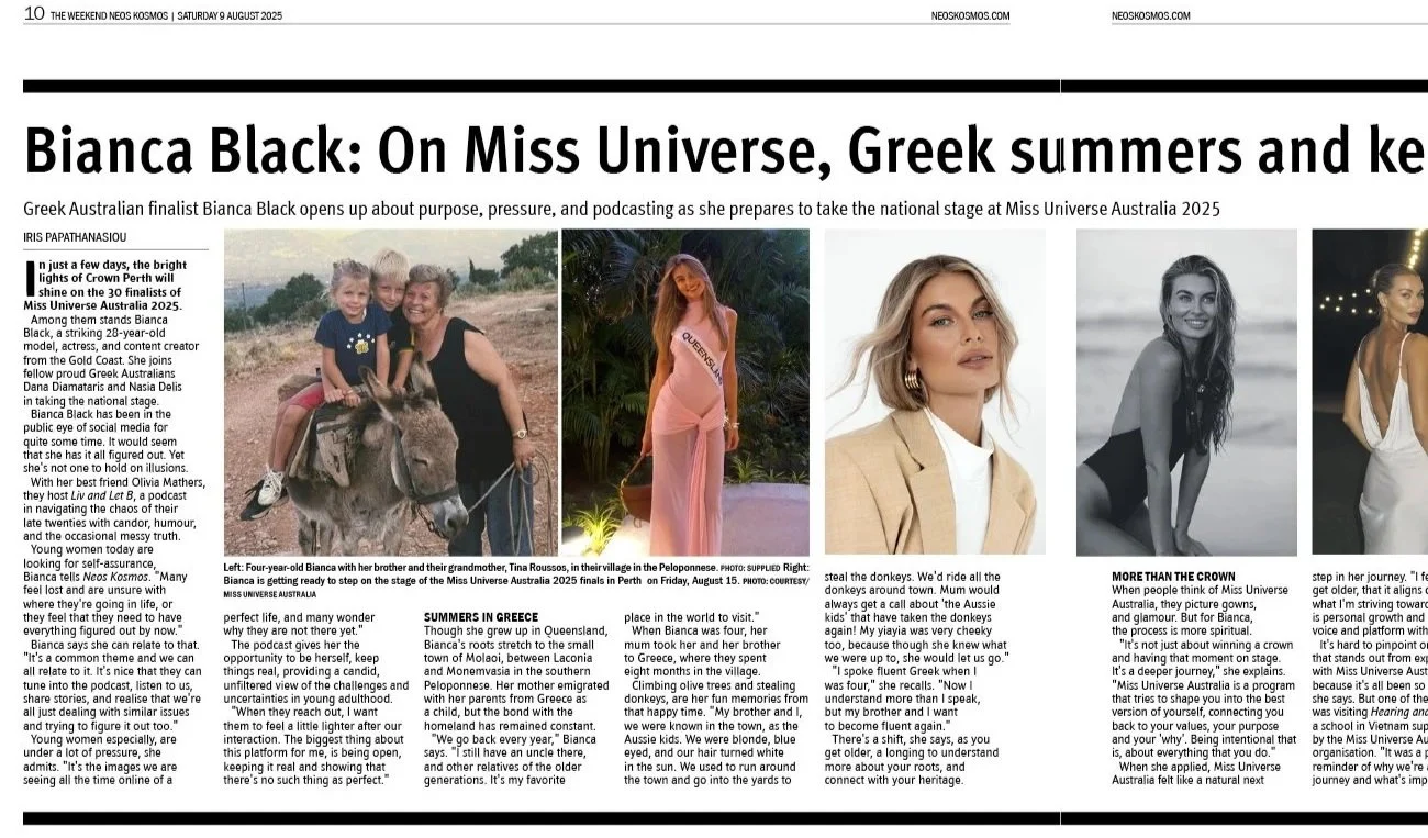 Greek Australian finalist Bianca Black opens up about purpose, pressure, and podcasting as she prepares to take the national stage at Miss Universe Australia 2025…